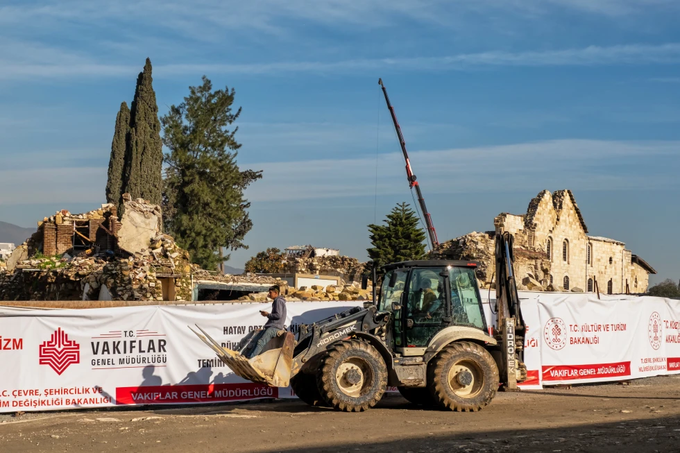 A construction vehicle passes the ruins of St. Paul Orthodox Church during debris removal efforts following the February 2023 earthquakes in Antakya, southern Turkey Wednesday, Feb. 4, 2026. (AP Photo/Murat Kocabas)