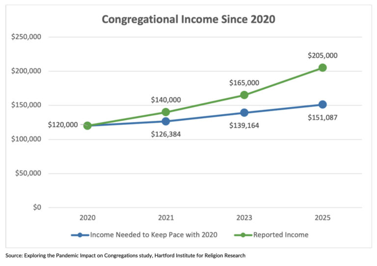 Median income grew from $120,000 in 2020 to $205,000 in 2025. The number of churches offering online giving rose from 58% in 2020 to 76% in 2025. As of 2025, about 40% of revenue came from online giving. Evangelical and non-Christian congregations were most likely to report a surplus. Mainline churches were more likely to report deficits. Thumma also noted that church expenses — especially for insurance and other building expenses — have grown.